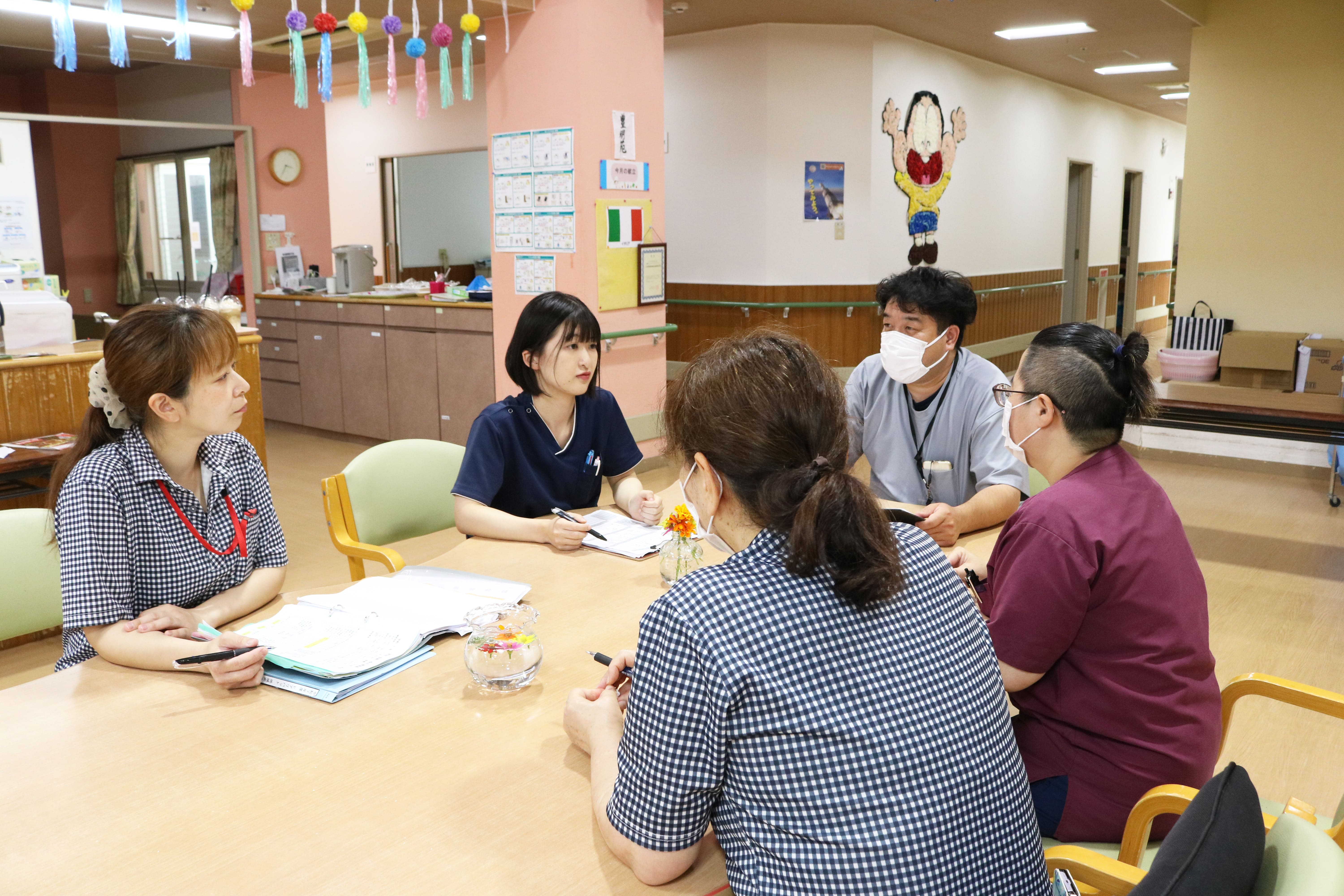 ご利用者に快適な暮らしを送っていただくため第一に必要なもの、それはスタッフの笑顔です。表情や声から伝わるメッセージは私たちの想像以上。イライラした顔や疲れ切った顔は悪影響しか与えません。前提として、みんなが楽しく働ける環境が不可欠。他職種の意見に耳を傾ける、みんながアイデアを出し合うなど、チームの一体感を大切にしています。スタッフが力と知恵を出し合う連携体制が自慢のひとつ。信頼できる仲間、いつでも相談できる仲間がいることは、仕事の楽しさを何段階も上げてくれます。